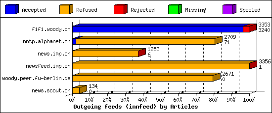 | 2 | nntp.alphanet.ch | 23 | 22663 | 651 | 2675 | 19337 | 2% | 23:56:05 |