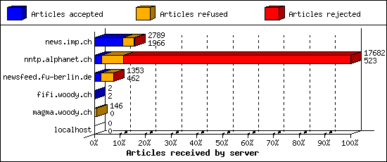 | 2 | nntp.alphanet.ch | 24 | 17682 | 523 | 1499 | 15660 | 2% | 24:27:14 |